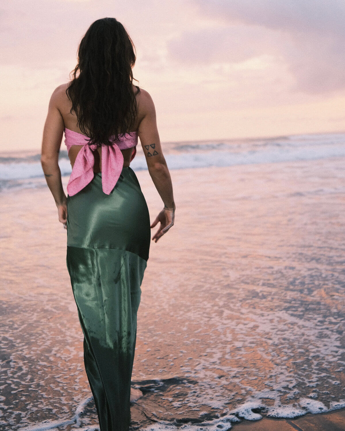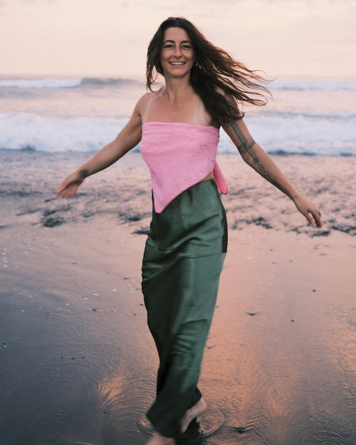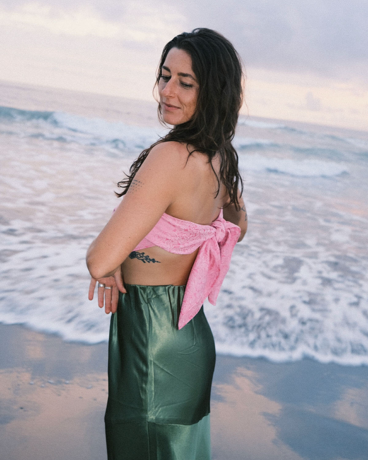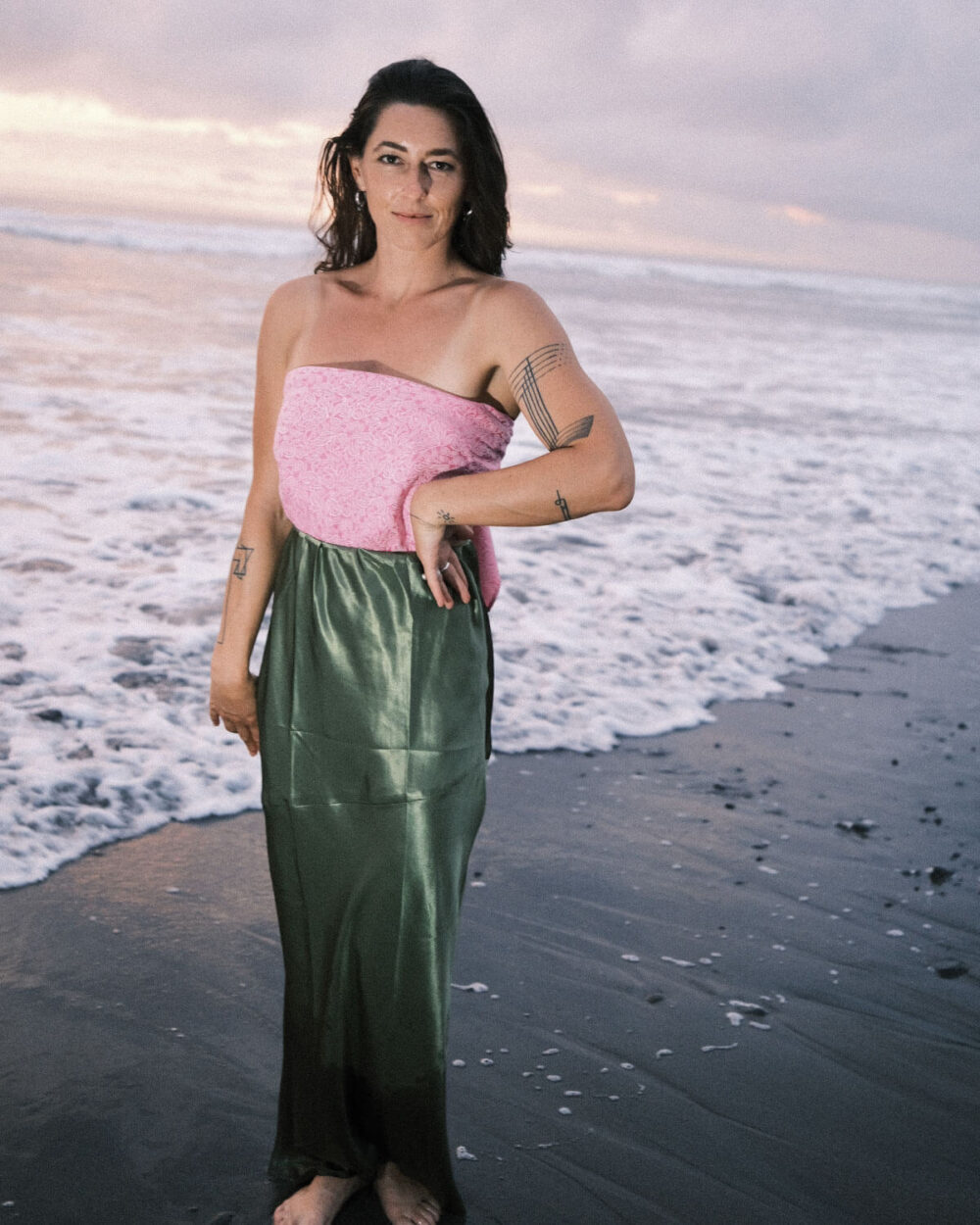 Igual que tú, no es simétrica, es auténtica. Es una falda pensada para acompañarte en todo: con jersey y botas en invierno, con camisa abierta en primavera, con sandalias o descalza en una celebración.  Oficina, cena, fiesta, ritual íntimo: Clorofila se adapta, pero nunca pasa desapercibida. Es para las mujeres que han entendido que sus marcas no las restan, las hacen únicas.