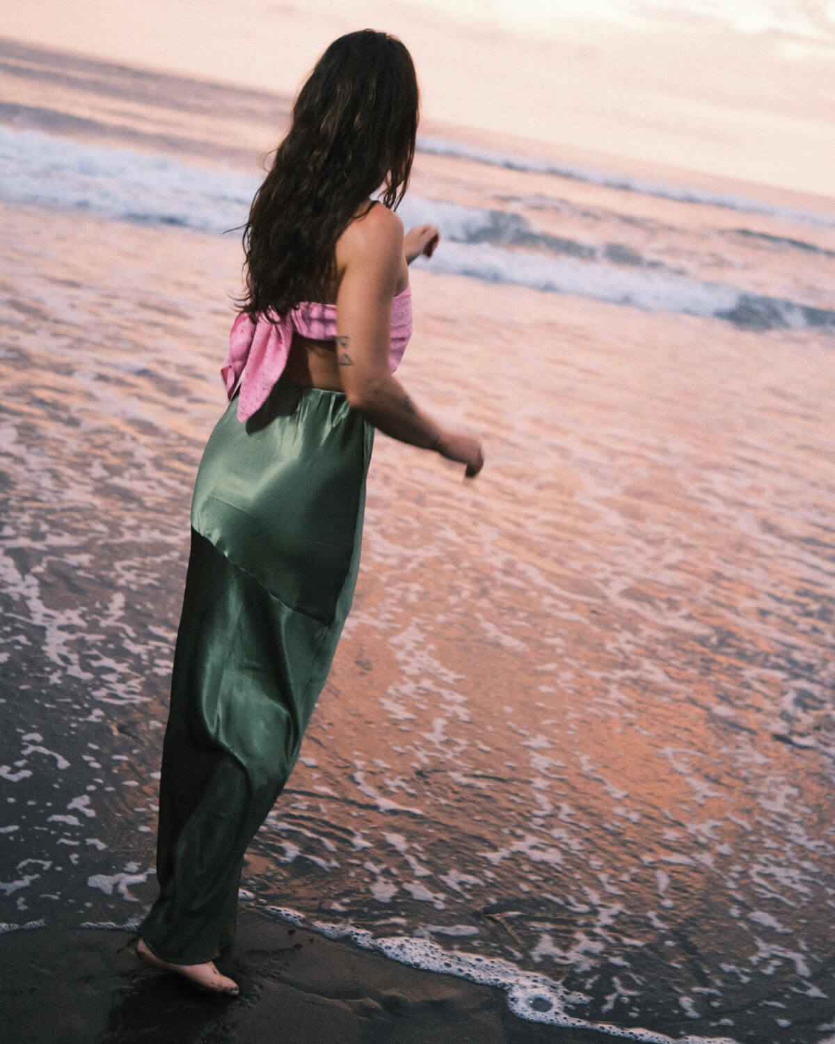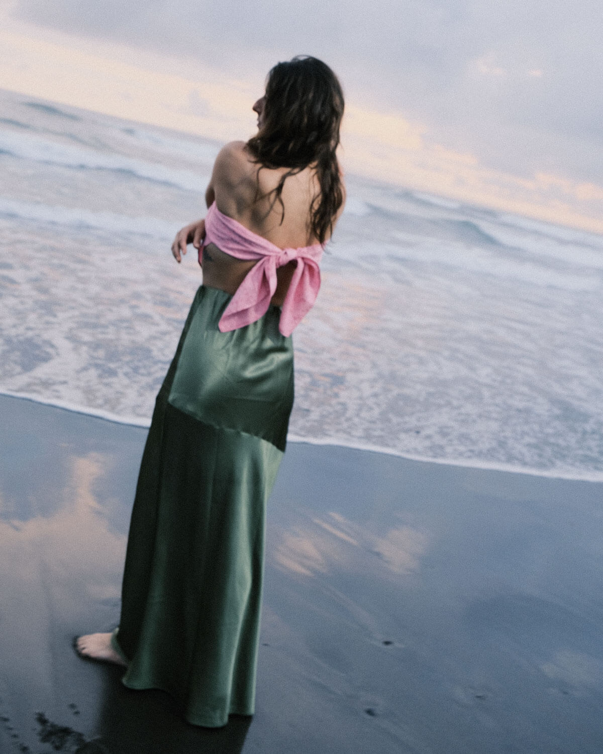 La falda Clorofila nace del momento en que el tallo del loto atraviesa el barro y decide ir hacia la luz. La mezcla 90% seda y 10% fibras resistentes equilibra belleza y realidad: una prenda delicada que está hecha para usarse de verdad, no para quedarse en el armario “para ocasiones especiales”. Cae suave y resistente sobre el cuerpo, dibujando juegos de brillo que se mueven contigo y te iluminan incluso en los días grises. El corte oblicuo rompe la línea perfecta a propósito: habla de giros, decisiones, heridas que han cicatrizado.